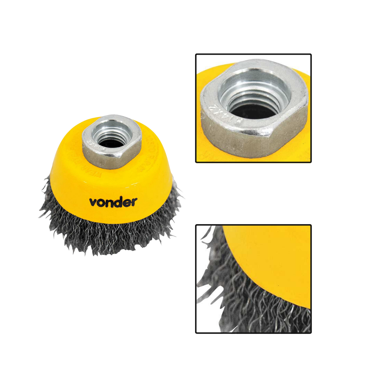 A escova tipo copo com rosca 2.1/2" ondulada para esmerilhadeira é indicada para limpeza pesada, remoção de ferrugem, tintas, rebarbas, corrosões e preparação de superfícies metálicas. Suas cerdas onduladas oferecem maior agressividade e cobertura uniforme, permitindo excelente desempenho na limpeza e acabamento de peças automotivas, estruturas metálicas, grades, chapas e ferramentas. Possui rosca para acoplamento rápido e seguro na esmerilhadeira, garantindo estabilidade durante o uso mesmo em altas rotações. Fabricada com materiais resistentes ao desgaste, oferece longa vida útil e alto rendimento, sendo ideal para oficinas, metalúrgicas, serralherias, funilarias, manutenção industrial e uso profissional intenso.