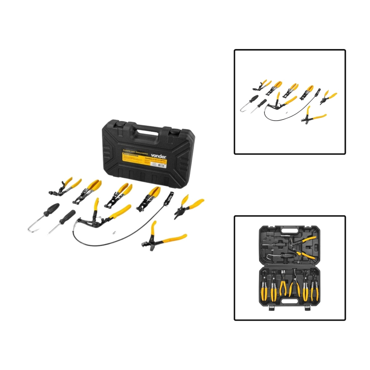 O Jogo de Alicates para Abraçadeiras com 9 peças é indispensável para quem busca precisão e eficiência na manutenção automotiva e industrial! Com um sistema de travamento que mantém a abraçadeira metálica aberta, facilita a instalação e remoção, economizando tempo e esforço. Seu design ergonômico, com cabo revestido em PVC, garante conforto e reduz a fadiga durante o uso prolongado. Inclui um alicate flexível com pontas para alcançar abraçadeiras em locais de difícil acesso, além de diversos modelos específicos para diferentes aplicações, como mangueiras de combustível, óleo, água e ar-condicionado. Acompanha uma chave manual com ponta Phillips e fenda e uma maleta plástica para organização e transporte!