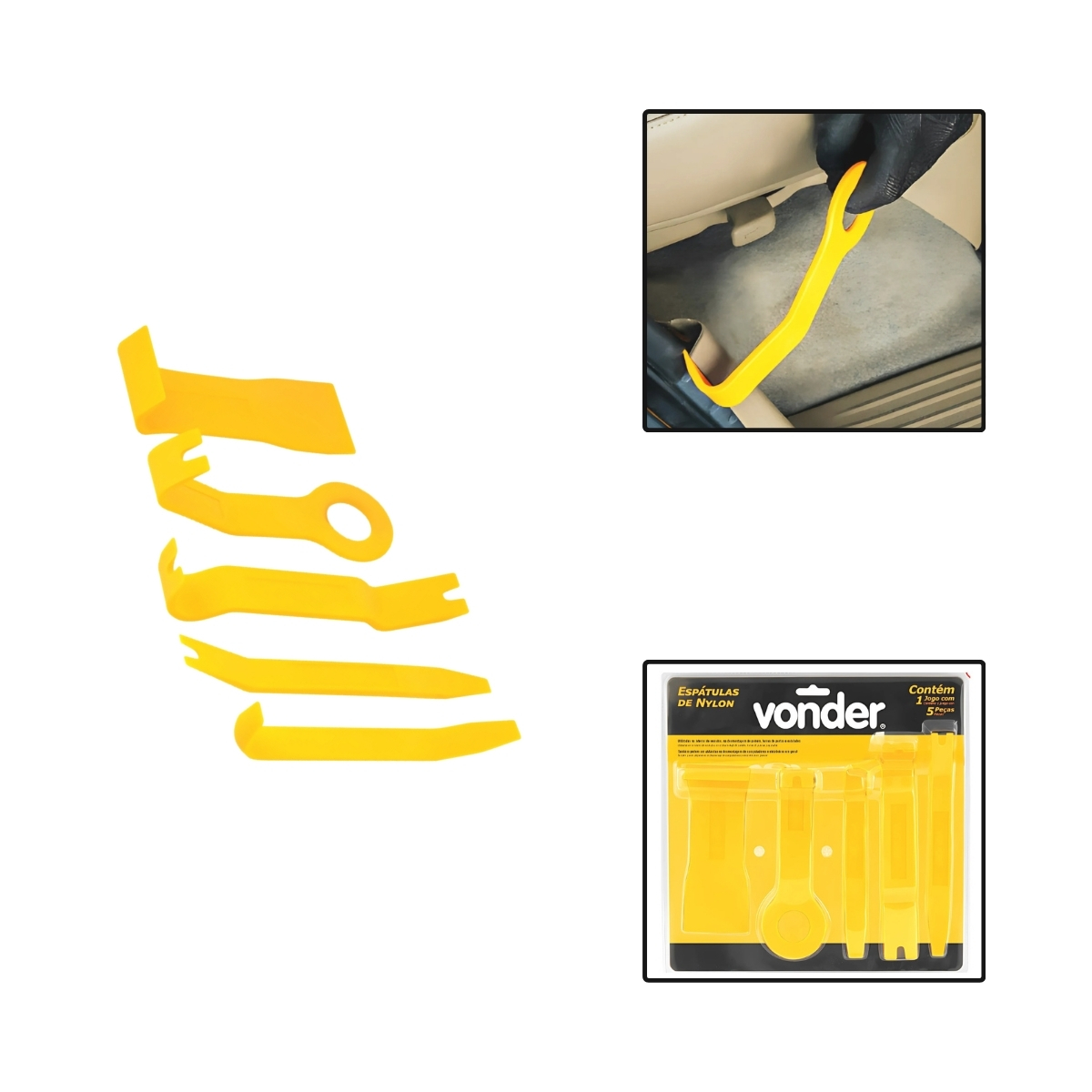O Jogo de Espátulas Automotivas de Nylon com 5 Peças é ideal para desmontagem, acabamento e remoção de componentes internos e externos sem causar danos, porque o nylon resistente protege superfícies sensíveis como painéis, forros, frisos, molduras e acabamentos; o conjunto com cinco formatos distintos amplia a versatilidade e facilita o acesso a pontos difíceis, reduzindo esforço e tempo de serviço; amplamente utilizado por profissionais de estética automotiva, funilaria e manutenção como prova social de sua eficiência, é um item de alta demanda e disponibilidade limitada, indicado para quem antecipa manutenções e busca praticidade, segurança e acabamento profissional com precisão.