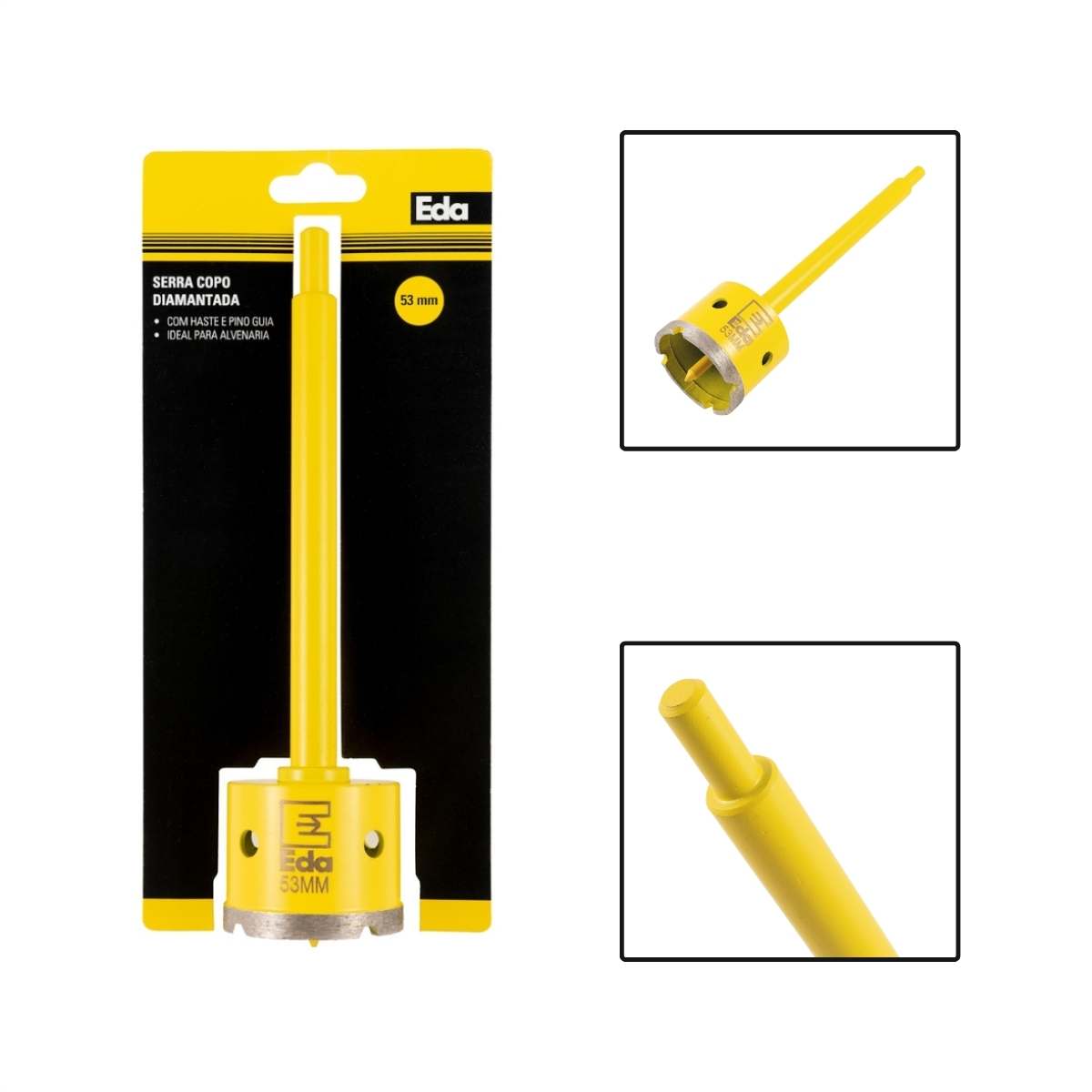 A Serra Copo Diamantada de 53mm com haste de 170mm e pino guia é perfeita para perfurações precisas em materiais como alvenaria, porcelanato e mármore. Com altura externa de 47mm e borda diamantada de 7mm, essa serra oferece durabilidade e segurança, garantindo cortes limpos e profissionais sem trincas ou quebras. O encaixe da haste de 8,8mm permite fácil fixação em mandris, e a espessura de 3,5mm do copo garante estabilidade durante o uso. Aproveite essa solução robusta e de alto desempenho, projetada para resultados de qualidade em cada aplicação!